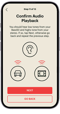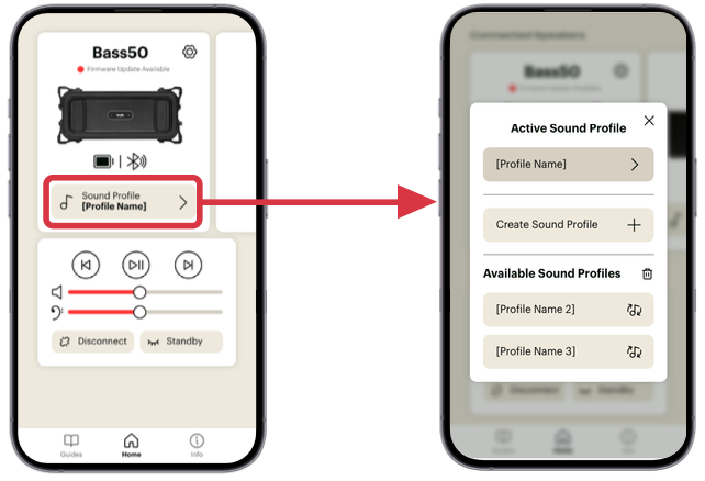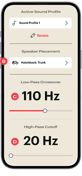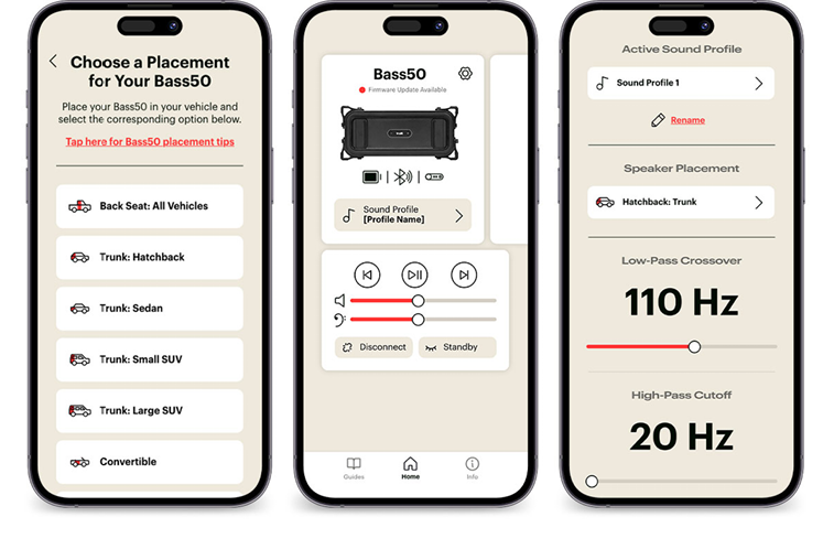 The Bass50 supports multiple sound profiles, and you can create a new one at any time. Each profile stores DSP settings, crossover adjustments, Time Correction data, and sound orientation. This makes it easy to switch between vehicles or rooms without reconfiguring every setting. Profiles are stored onboard the Bass50 and travel with it — not your phone — so changes persist even when switching devices.