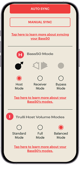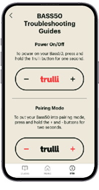 The Trulli app is more than just a companion — it’s the central interface for unlocking the full power and flexibility of your Bass50. With it, you can control every major function of the subwoofer, from basic volume control to advanced audio tuning, remote pairing, profile management, and firmware updates. This section walks you through each feature of the app and explains how to use it to get the best performance from your system.