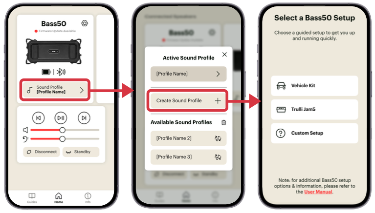 | From the home screen, tap the Sound Profile button to open the Sound Profile menu. | Then tap the Create Sound Profile button to start the process of adding a new profile. | Complete the guided flow to create your new sound profiles. |