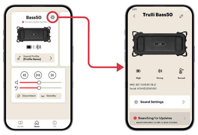 Tap the gear icon next to your Bass50’s name on the Home Screen to access the full System Settings.