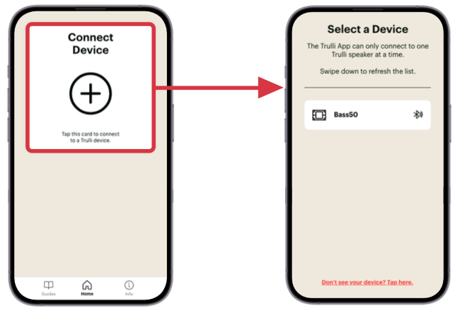 This screen appears when your app is not connected to any Trulli devices. Tap the “+” button to search for available Trulli-compatible devices nearby. If you’re connecting to a new Bass50 for the first time, the app will guide you through creating its initial sound profile.