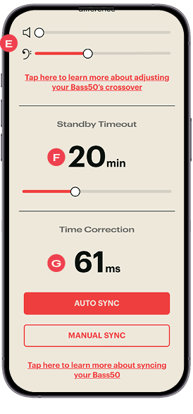 A. Device Header: Displays your Bass50’s name. If a firmware update is available, it will appear directly underneath. Tap the gear icon next to the name to access the System Settings menu.