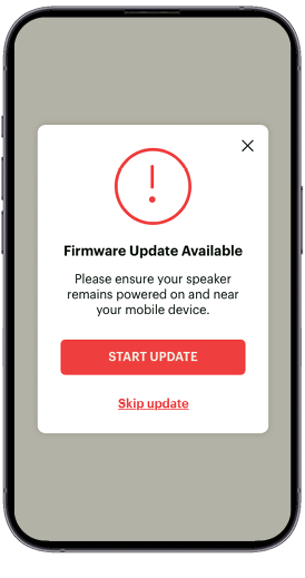 From time to time, Trulli Audio will release firmware updates for your Bass50 and Trulli Remote, ranging from minor enhancements to new features. To ensure the best performance and user experience, we strongly encourage you to keep your Bass50, Remote, and mobile app updated regularly. When a firmware update is available, you will see a notification within the app prompting you to perform the update. (See screenshot below.) Occasionally, certain firmware updates may be mandatory. In these cases, the app will require you to complete the update before continuing usage. Preparing for the Firmware UpdateBefore initiating a firmware update, ensure that your Bass50 battery is sufficiently charged. You can verify battery status by checking the battery indicator icon within the app. A red battery icon indicates a low charge, and the firmware update may be restricted. If the battery icon is red, please connect the Bass50 to the Trulli wall charger to continue with the update.
