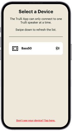 Once permissions are granted, the app will prompt you to power on your Bass50. It will then scan for nearby Trulli devices in pairing mode. Select your Bass50 from the list.