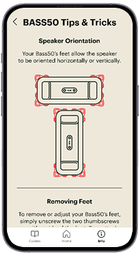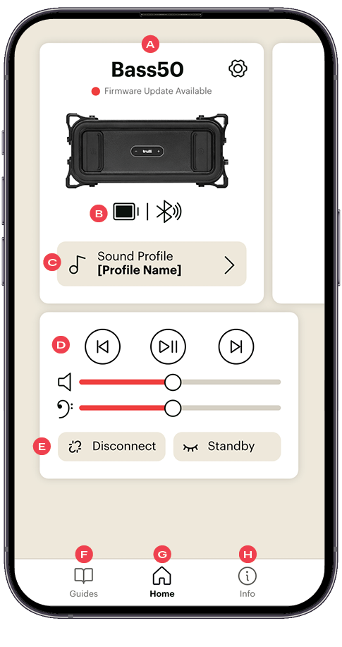 F. Guides: Tap to access visual walkthroughs for physical buttons and controls on the Bass50, Trulli Remote, or Jam5.