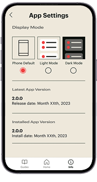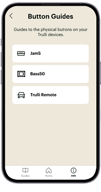 At the bottom of the Trulli App, you’ll find three core navigation buttons: Guides, Home, and Info. The Guides button is your gateway to quick-reference guides for the physical buttons and controls on your Trulli devices.